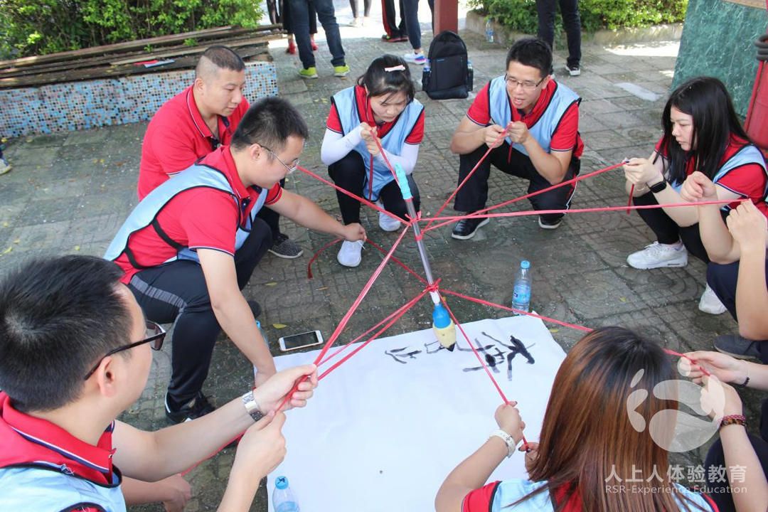 ▼妙筆生花:每個人都是握筆的一員,團隊集中精力,相互配合才能把字寫好。