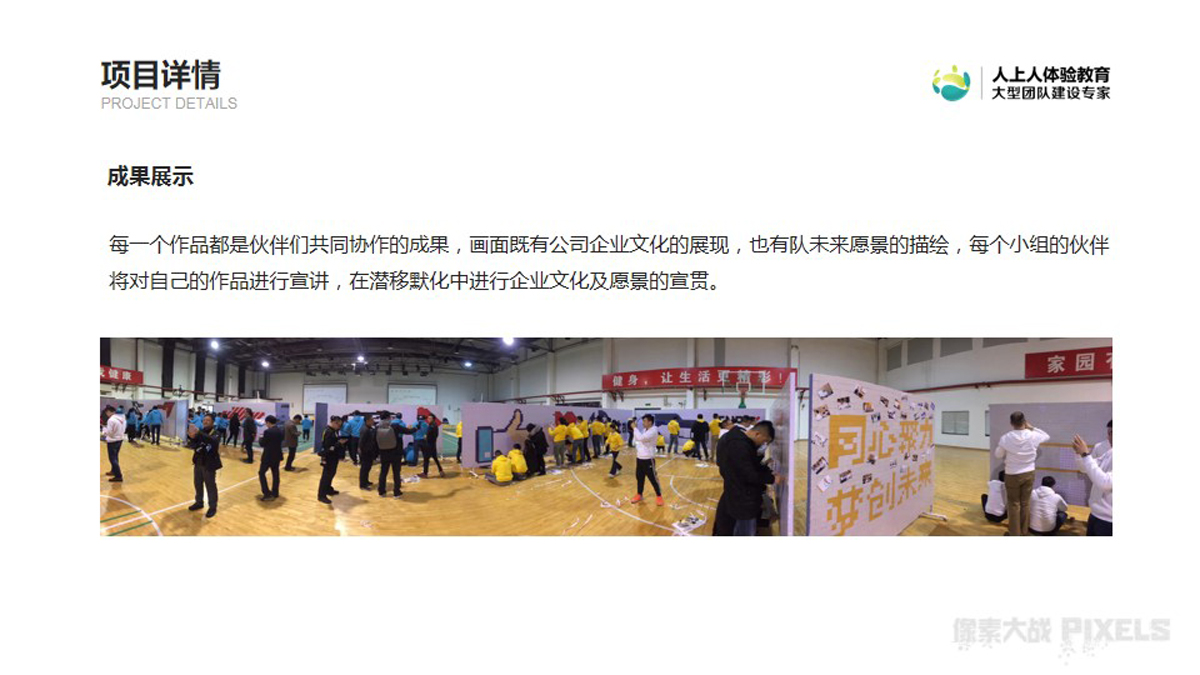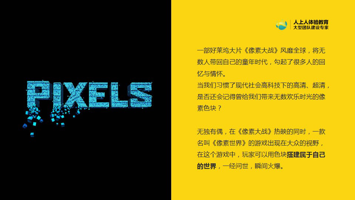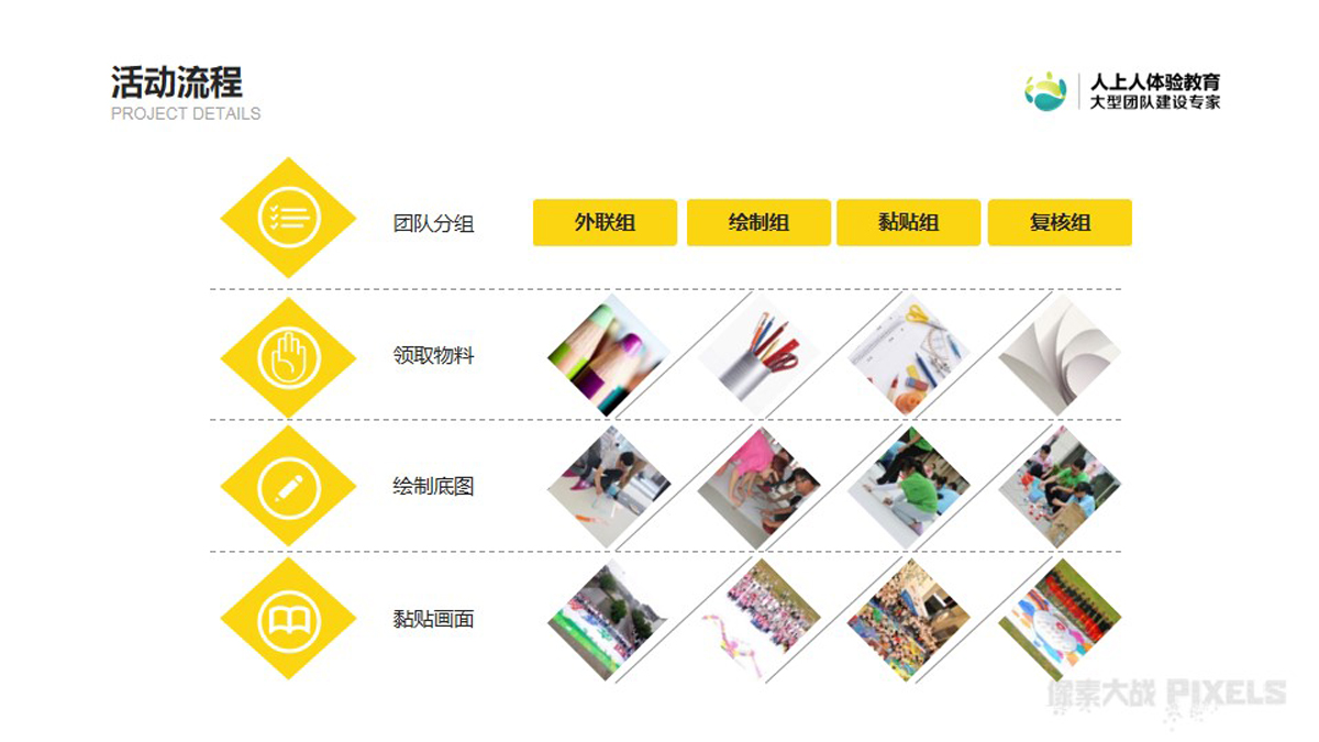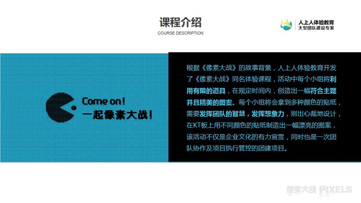 根據(jù)《像素大戰(zhàn)》的故事背景,人上人體驗(yàn)教育開(kāi)發(fā)了《像素大戰(zhàn)》同名體驗(yàn)課程,活動(dòng)中每個(gè)小組將利用有限的道具,在規(guī)定時(shí)間內(nèi),創(chuàng)造出一幅符合主題并且精美的圖案。每個(gè)小組將會(huì)拿到多種顏色的貼紙,需要發(fā)揮團(tuán)隊(duì)的智慧,發(fā)揮想象力,別出心裁地設(shè)計(jì),在KT板上用不同顏色的貼紙制造出一幅漂亮的圖案,該活動(dòng)不僅是企業(yè)文化的有力宣貫,同時(shí)也是一次團(tuán)隊(duì)協(xié)作及項(xiàng)目執(zhí)行管控的團(tuán)建項(xiàng)目。