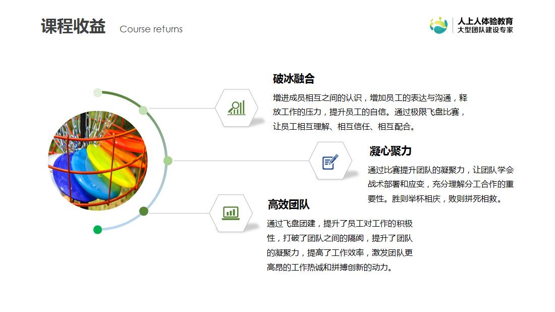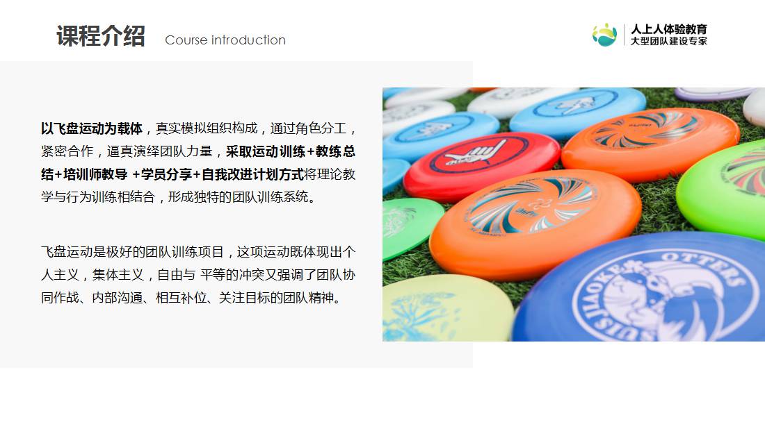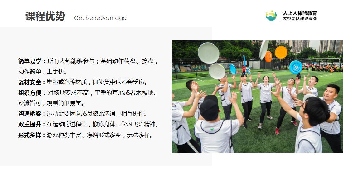 很多人喜歡極限飛盤,不僅是追求運(yùn)動(dòng)的競(jìng)技性,更多是因?yàn)?ldquo;飛盤精神”——相互尊重、相互信任。課程以飛盤運(yùn)動(dòng)為載體,真實(shí)模擬組織構(gòu)成,通過角色分工,緊密合作,活力展現(xiàn)團(tuán)隊(duì)力量。