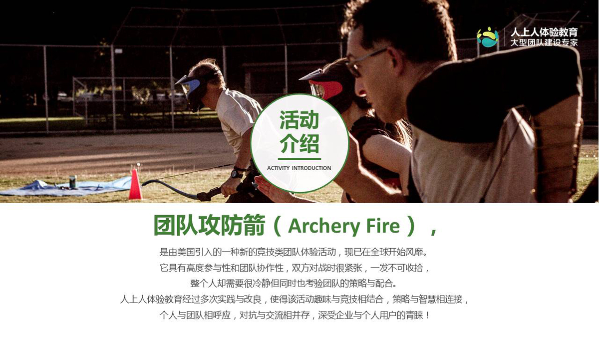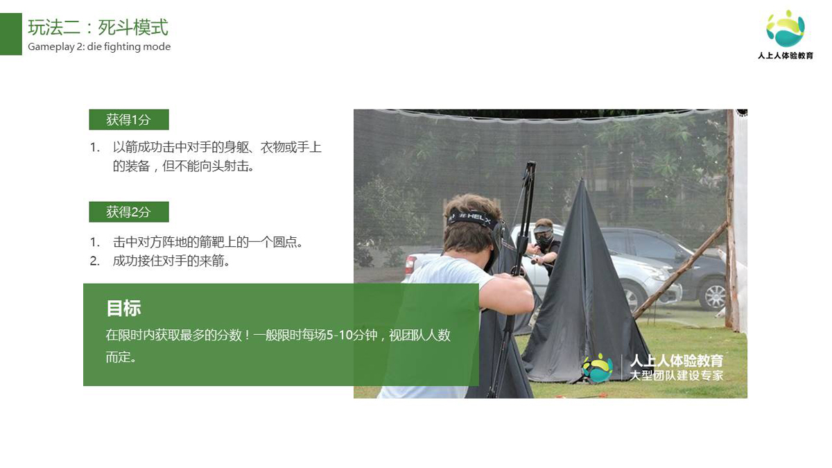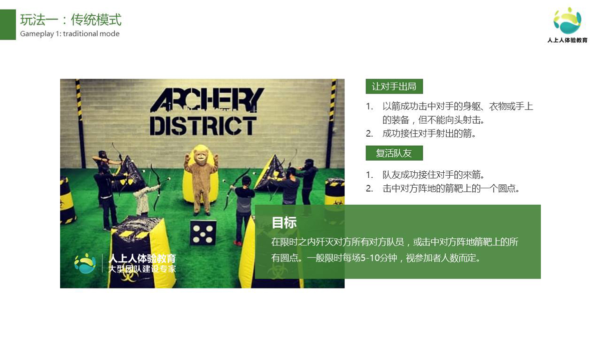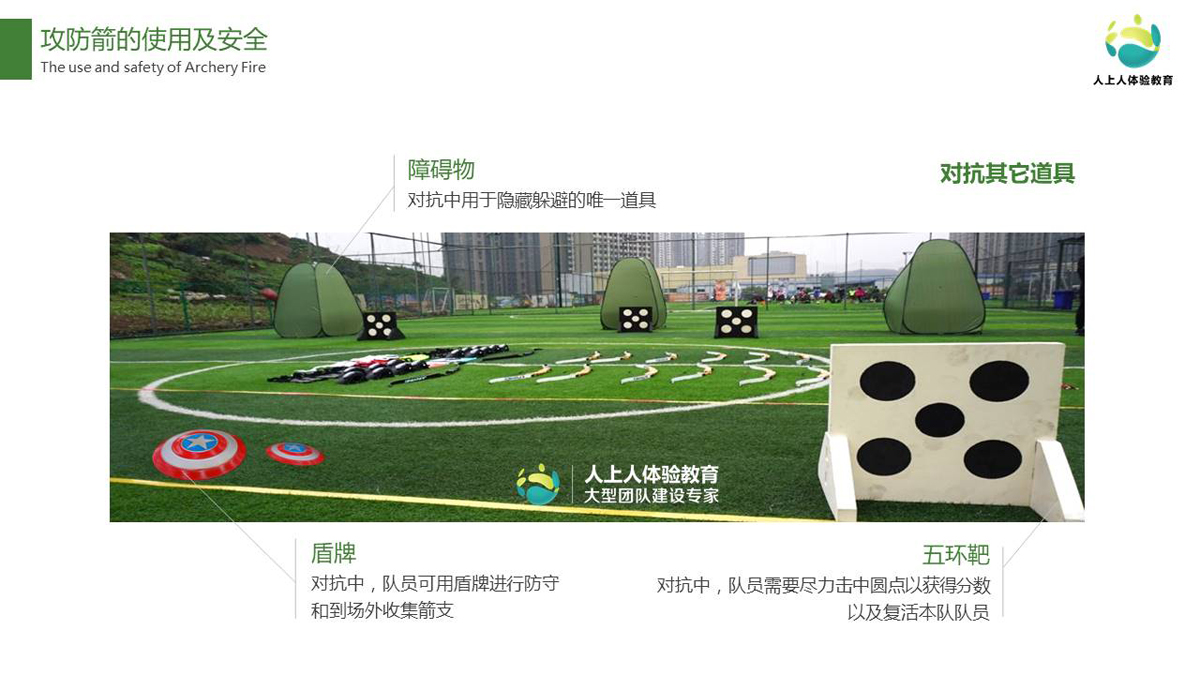 所有學(xué)員分為攻防兩組,以特制弓箭為道具,配合盾牌等防護(hù)裝置,在傳統(tǒng)模式和競(jìng)技模式下,手持弓箭射擊敵方,雙方需要射擊更多的敵人,從而占領(lǐng)敵方營(yíng)地,贏得勝利。