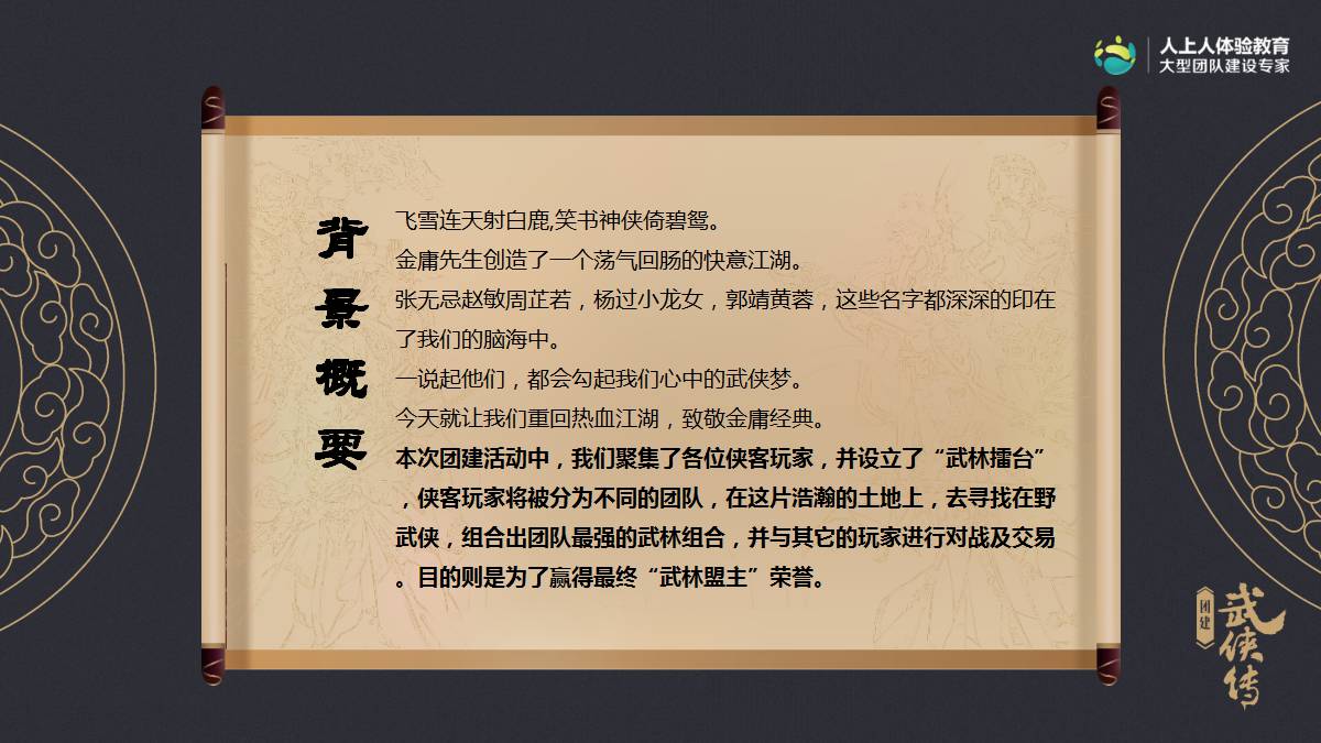 1.概述:飛雪連天射白鹿,笑書神俠倚碧鴛。金庸先生給世人創(chuàng)造了一個蕩氣回腸的快意江湖。今天就讓我們重回熱血江湖,致敬金庸經典。我們會聚集眾多俠客玩家,并設立“武林擂臺”,共赴武林盛事。俠客玩家將被分為不同的團隊,在這片浩瀚的土地上,去尋找在野武俠,組合出團隊最強的武林組合,并與其它玩家進行對戰(zhàn)及交易,以贏得最終“武林盟主”的盛大榮譽。