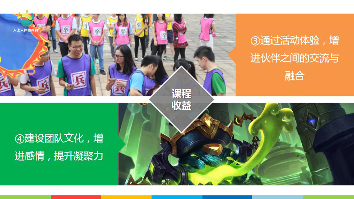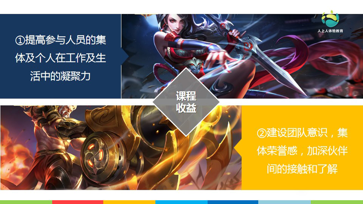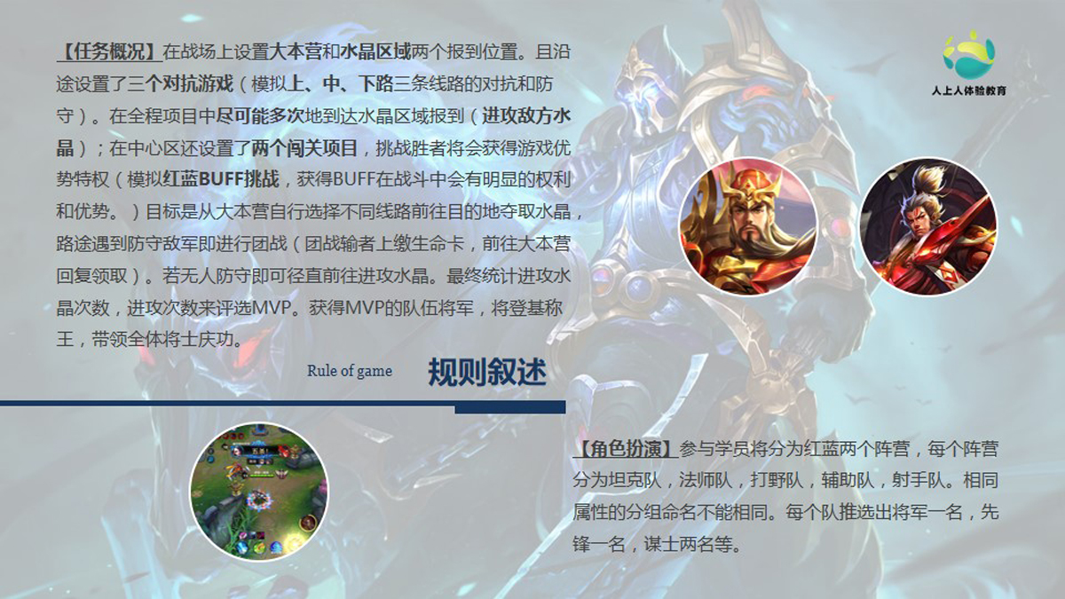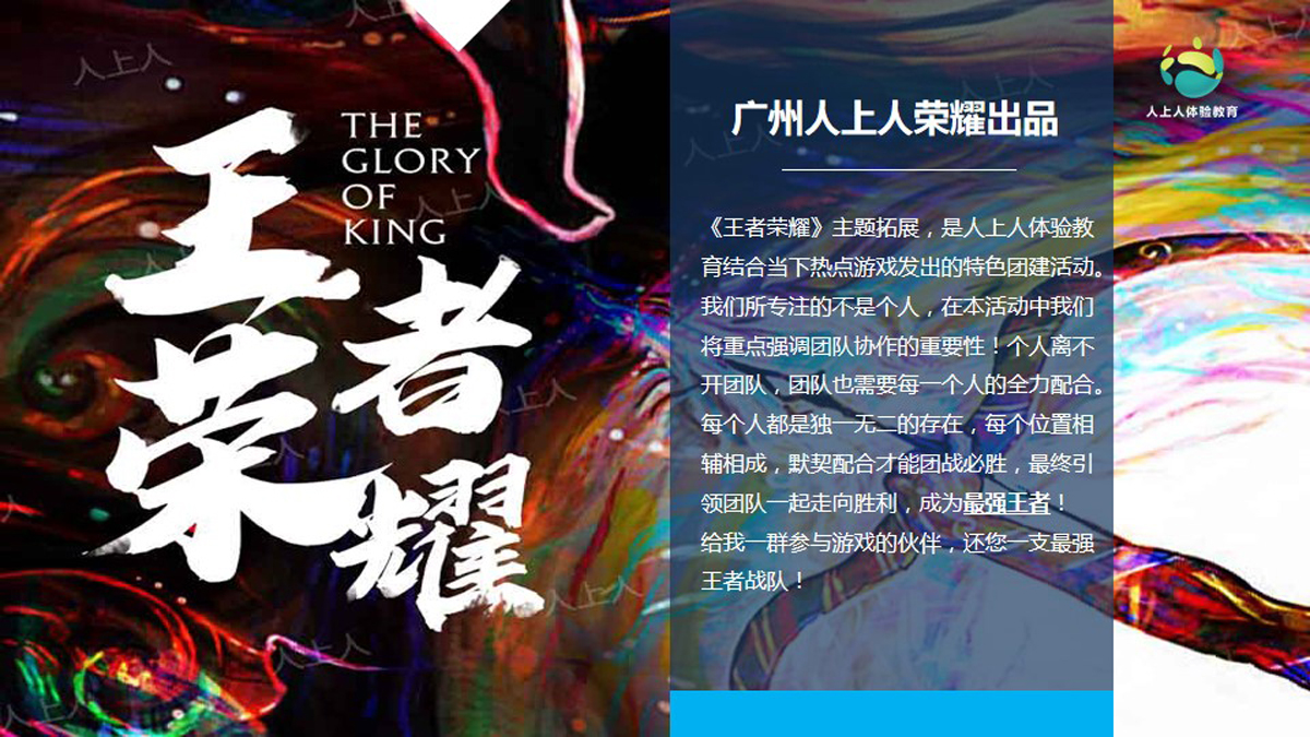 王者榮耀手游的真人版!學員需要分為紅藍兩個陣營,分別扮演著射手、法師、肉盾的角色,進行三條路線的攻防PK。一場攻城掠地的大戰(zhàn)一觸即發(fā)。活動與時下的時尚游戲緊密結合,能增強學員參與度!